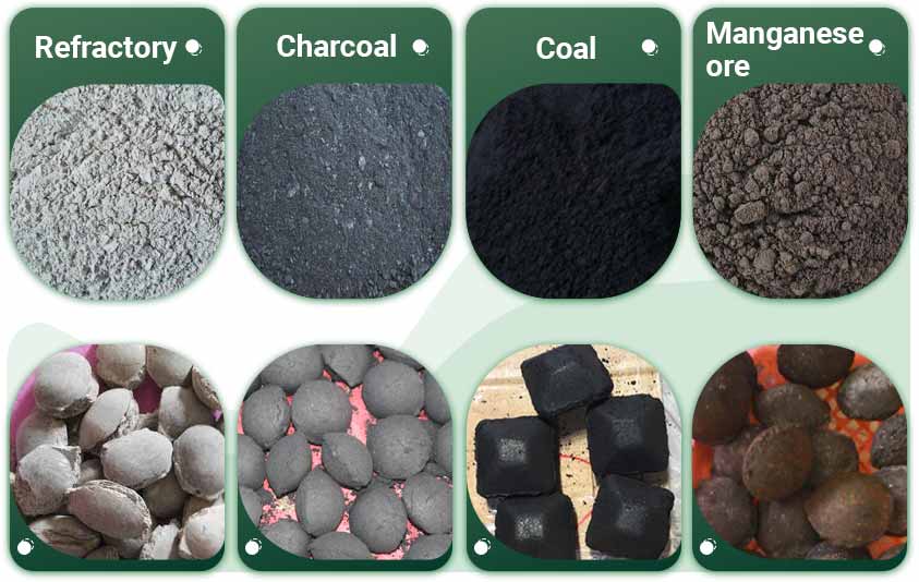 The briquettingmachine can be used to press iron filings, iron oxide scale, coal powder, ironpowder, coking coal, aluminum powder, gypsum, tailings, carbon powder, slag,sludge, kaolin, activated carbon, coke powder and other powders.