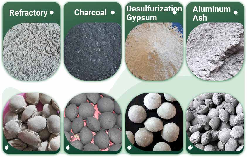 The briquettingmachine can be used to press iron filings, iron oxide scale, coal powder, ironpowder, coking coal, aluminum powder, gypsum, tailings, carbon powder, slag,sludge, kaolin, activated carbon, coke powder and other powders.